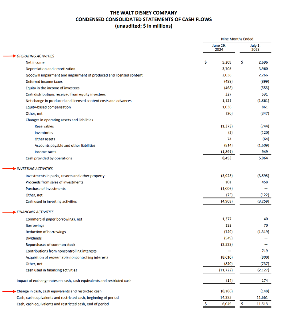 A statement of cash flows, however, is the most accurate way to determine how successfully a company is run on a monthly, quarterly, or annual basis. Take the below cash flows statement from The Walt Disney Company, for example: