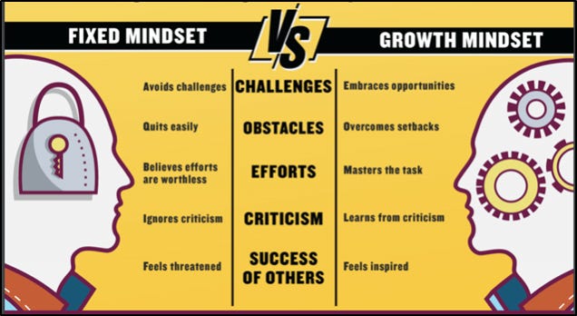 Dweck’s research found that there are two kinds of mindsets among people: fixed and growth. To boil it down quite simply, people with a fixed mindset believe someone’s intelligence is fixed – you’re born with it and you cannot improve it, no matter how hard you try. A growth mindset means you believe that your intelligence is malleable, and you can improve it with deliberate effort.