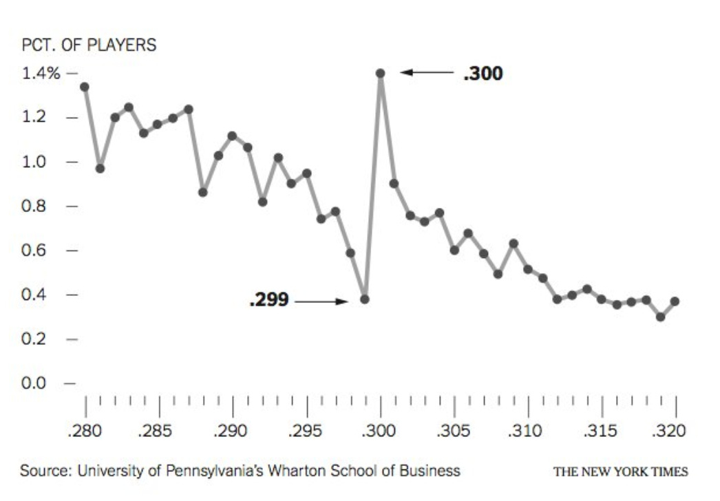 If a player was hitting .299 going into the last game of the season, they always attempted to get a hit – many struck out and had their average drop a point, while others got that hit, raised their average to .300, and were promptly removed from the game to secure their final stat line. What was mind-blowing is that, in pursuing this line of questioning, the authors found that in the over 100 years that baseball has existed, there has never been a batter who, when sitting at a .299 average on the last day of the season, walked in their last at bat of the season. Why? Because if you walk, your average is not affected at all. It’s as if the at-bat never occurred. And no one wants to be the person who nearly hit .300. The value of being a .300 hitter, both financially and historically, is immense.